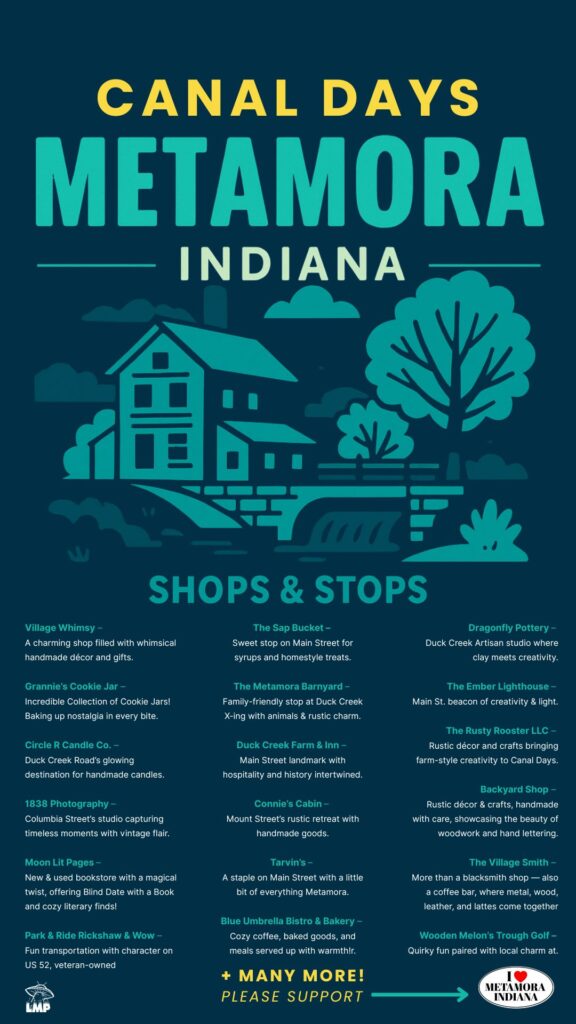 Metamora’s businesses are the heartbeat of the festival. Each one offers something unique — from handmade goods to baked treats. Here are the must-stop shops at Canal Days: